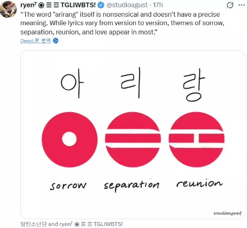 Tuy nhiên, ý nghĩa của “Arirang” đa dạng và phức tạp như chính lịch sử của Hàn Quốc vậy đó. Một số fan và học giả đưa ra những góc nhìn khác. Một bạn chỉ ra rằng từ “Arirang” có lẽ không có một ý nghĩa duy nhất và chính xác, đồng thời lưu ý rằng mặc dù lời bài hát có thể khác nhau giữa các phiên bản, nhưng chủ đề về nỗi buồn, sự chia ly, đoàn tụ và tình yêu luôn hiện hữu. Một nhận xét thú vị từ một fan trên Allkpop Forum đã thêm một lớp nghĩa khác: “Ý nghĩa đầu tiên của ‘Arirang‘ rất đơn giản. Đó là một bài hát. Thực tế, đây là bài dân ca truyền thống nổi tiếng nhất ở Hàn Quốc đó. Nhưng khi người Hàn Quốc nói về ‘Arirang,’ họ sẽ nói với bạn rằng đây không chỉ là một bài hát nổi tiếng. Thay vào đó, việc nghe và hát bài hát này chạm đến tâm hồn hay ‘han’ (한) của Hàn Quốc.”