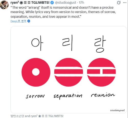 Các trang báo quốc tế và fan hâm mộ đang rần rần phân tích nguồn gốc và ý nghĩa sâu xa của “Arirang” hết sảy. Chẳng hạn, Forbes đưa tin rằng theo nghiên cứu ngôn ngữ, “Ari” (아리) trong tiếng Hàn cổ có nghĩa là “xinh đẹp”, còn “Rang” (랑) có nghĩa là “người yêu”, thường được dịch là “người yêu dấu của tôi” đó. Tương tự, Sportskeeda cũng đồng tình với ý kiến này, cho rằng “Ari” là vẻ đẹp và “Rang” là người trân trọng, tạo thành cách hiểu là “người yêu dấu của tôi“. Cách giải thích này đã chạm đến trái tim của rất nhiều fan, một bạn tên Carolyne đã tweet rằng, “Album mới của BTS tên là ‘ARIRANG’ có nghĩa là ‘người yêu dấu của tôi’ và mỗi thành viên sẽ có phiên bản riêng?! 😭”, bài đăng này đã nhận được hơn 163,000 lượt thích đó nha.