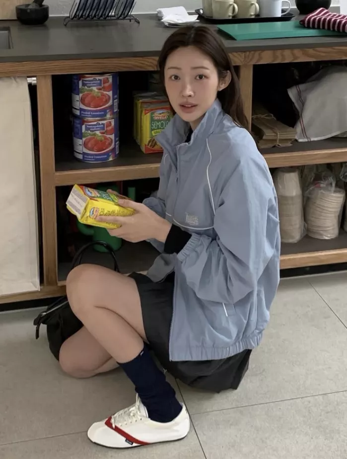Cha Jung-won từ lâu đã được ca ngợi vì khả năng nâng tầm những bộ trang phục đơn giản bằng một điểm nhấn hoàn hảo. Trong trường hợp này, đó là chiếc áo khoác gió màu xanh da trời đã thay đổi hoàn toàn không khí của bức ảnh. Màu sắc tươi mới của chiếc áo, kết hợp với phom dáng gọn gàng, hài hòa một cách liền mạch với nét duyên dáng trời phú của Cha Jung-won, tạo nên một vẻ ngoài vừa thể thao vừa sang trọng.